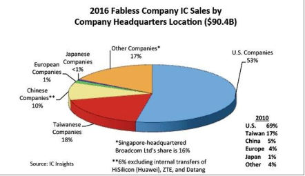 部分國內企業已擁有較強國際競爭力。中國大陸 IC 設計公司從 2015 年的736 家大幅增加到 2016 年的 1362 家。在純設計企業方面,2009 年大陸僅有深圳海思半導體一家進入全球前 50 純 IC 設計業者之列,而 2016 年已有海思、展訊、中興微電子等 11 家企業進入。我國純 IC 設計業者合計銷售額占全球的比例已從 2010 年的 5%提升至 2016 年的 10%。
